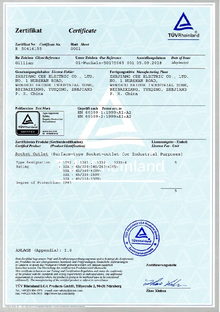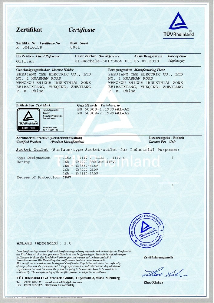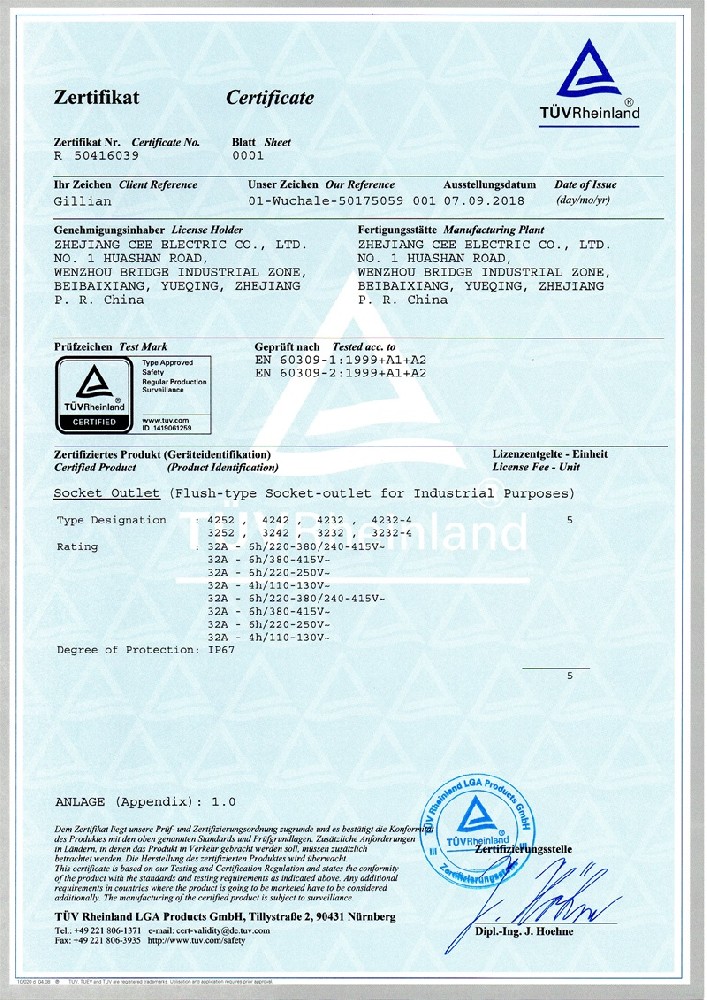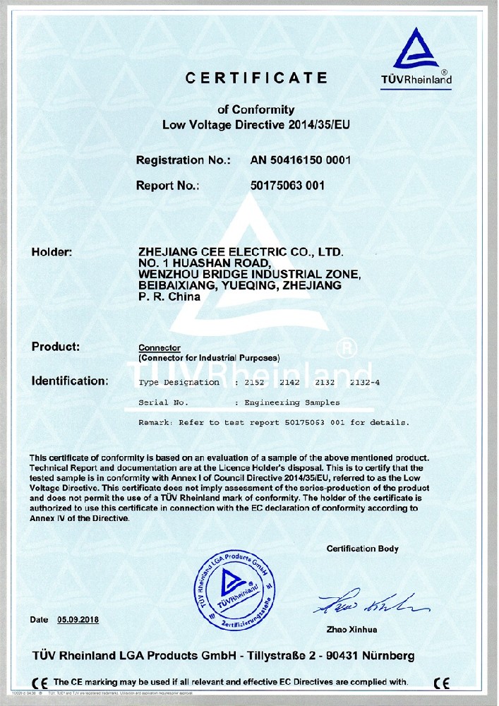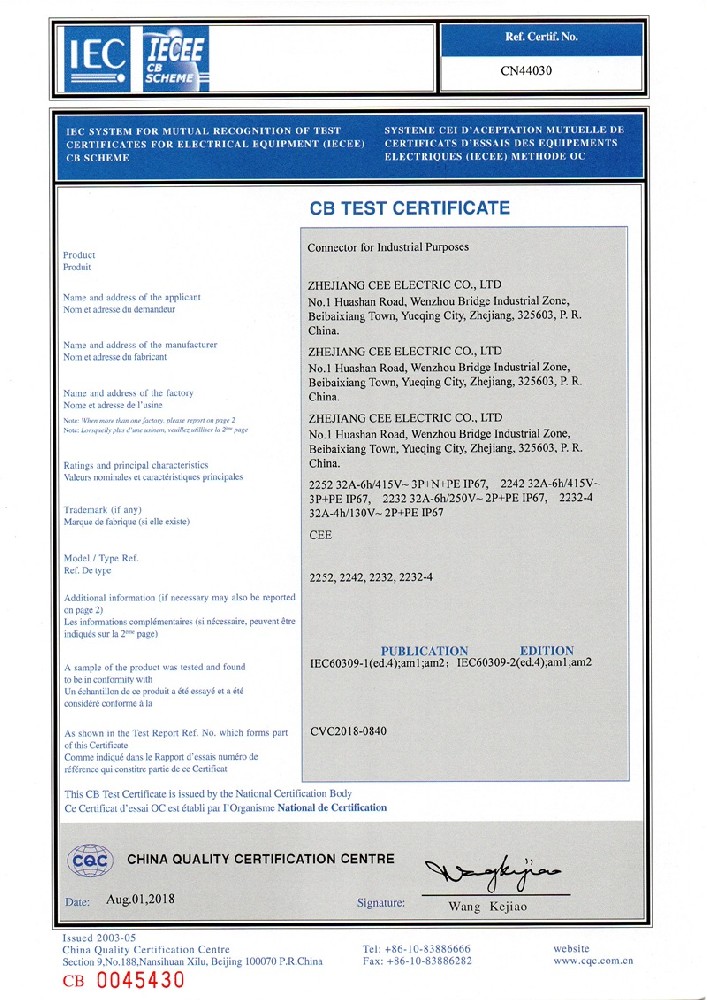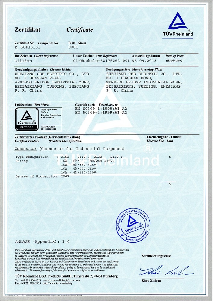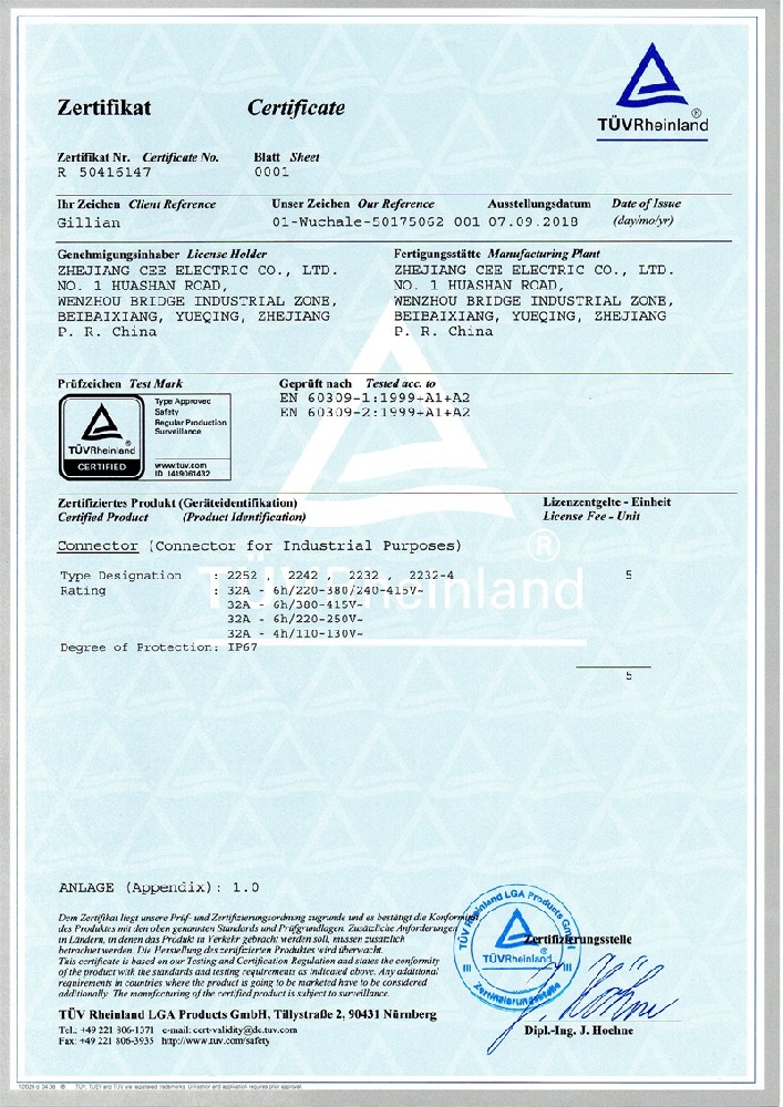 品質合規方面,公司全面推行ISO9001:2015質量管理體系,核心產品符合IEC 60309-1-2、EN 60309-1-2等國際標準,通過Intertek、TUV Rheinland、CQC等權威機構認證,持有TUV、SEMKO、CE、CCC等多項資質證書,且完全滿足RoHS、Reach等國際法規要求。